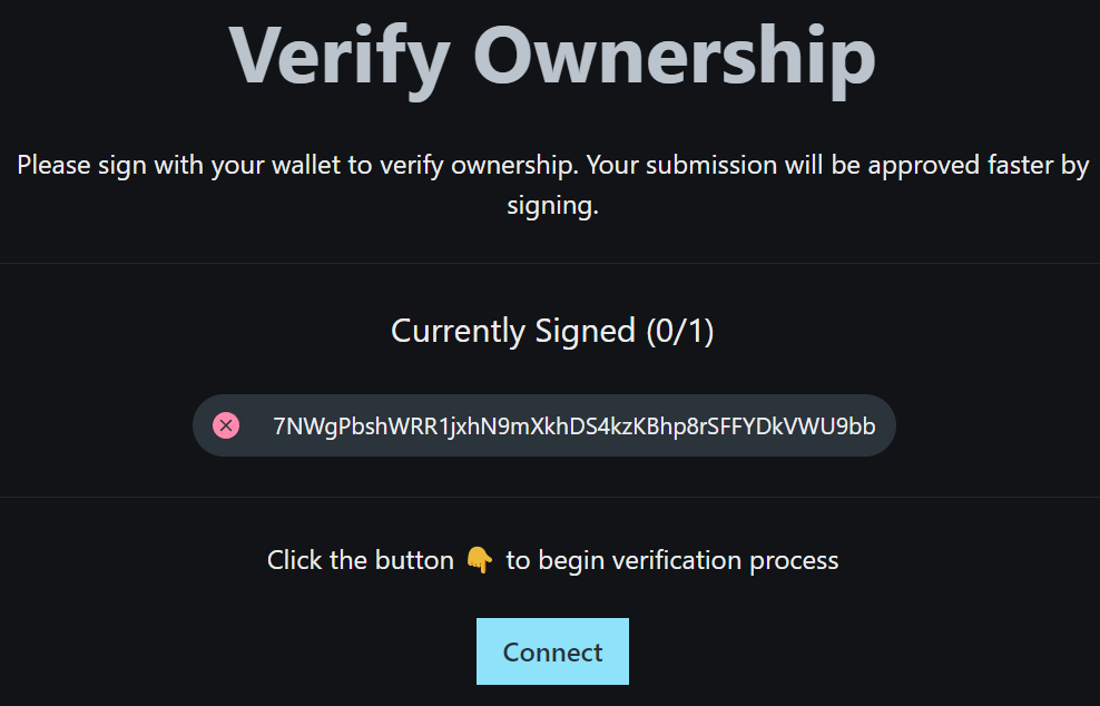 To further authenticate your ownership, it is recommended to connect and sign with your Update Authority wallet.