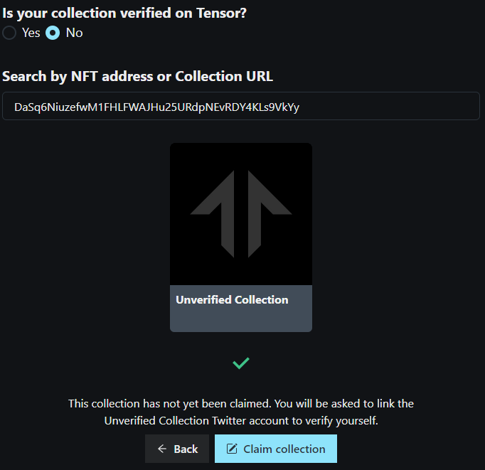 <figure><img src="https://3364018093-files.gitbook.io/~/files/v0/b/gitbook-x-prod.appspot.com/o/spaces%2FTP1CBEbwTzCoyWl9J8MH%2Fuploads%2FmFMgwkeTcbU2AXbwmRri%2Fimage.png?alt=media&#x26;token=03817e8b-3332-4b39-88eb-276b585b4e99" alt=""><figcaption><p>Fill in the search bar with your NFT's ID address or the on-chain Collection ID</p></figcaption></figure>
